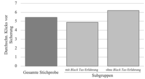 Es zeigt sich eine statistisch signifikante Korrelation (p-Wert < 0,05) zwischen Risikobereitschaft und der Erfahrung mit Black Tax. Die Black Tax-Erfahrungen reduzieren die durchschnittliche Klickzahl um 1,05. Bei einem Gesamtdurchschnitt von 5,4 Klicks stellt diese eine substanzielle Veränderung dar. Die Ergebnisse halten auch verschiedenen Robustheitskontrollen stand.